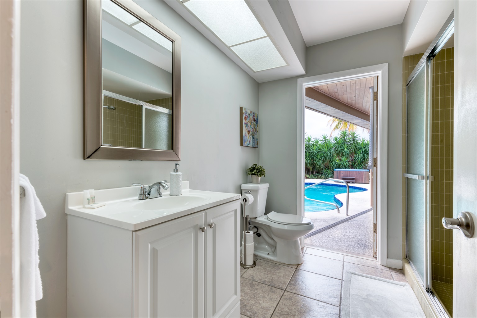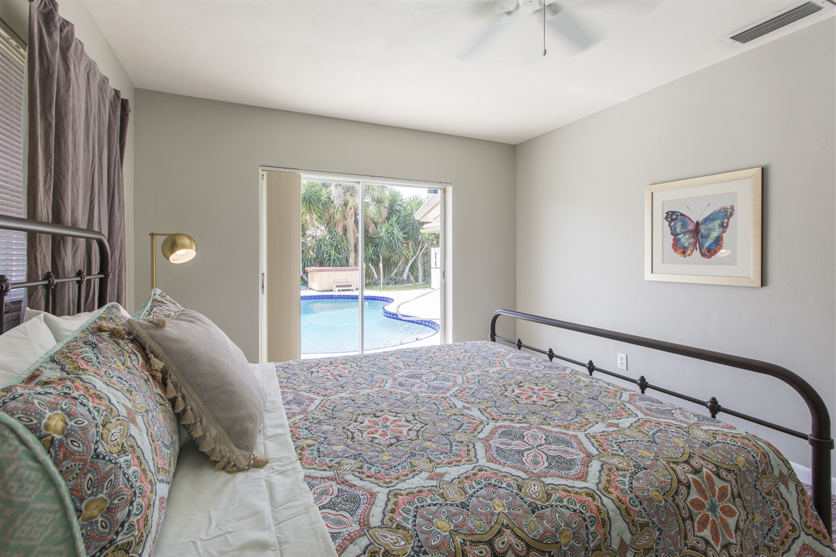 1- King bed & en-suite bathroom with a step-in shower. The room has a ROKU TV for streaming and access to the outdoor pool deck.