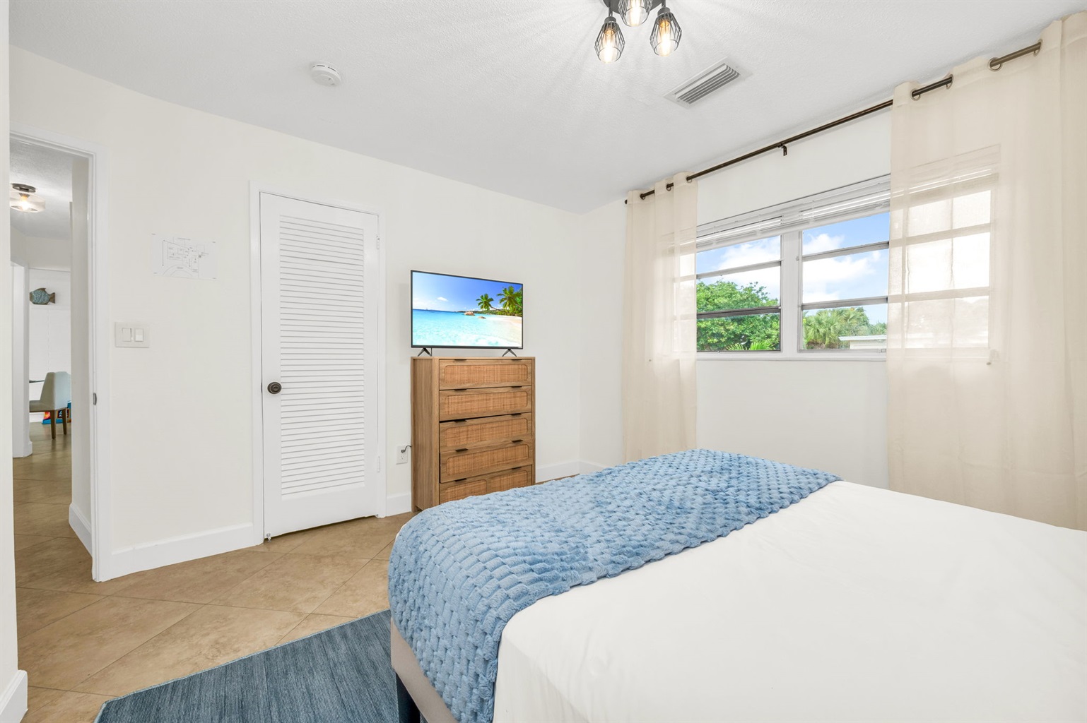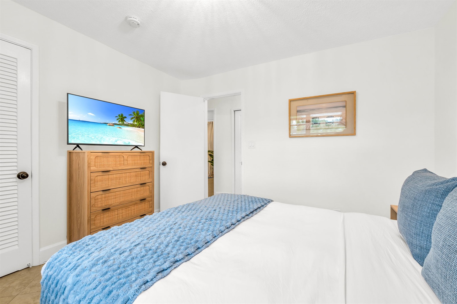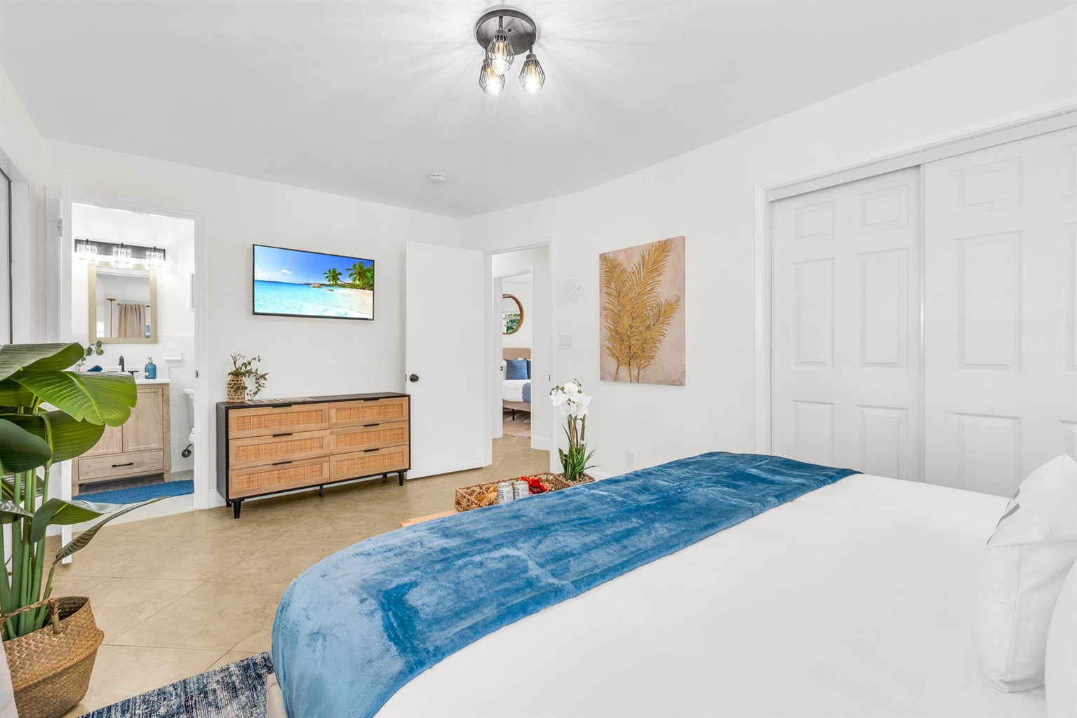 - Primary Bedroom: King bed with premium, hotel-quality linens, clothing storage, and a Roku TV.