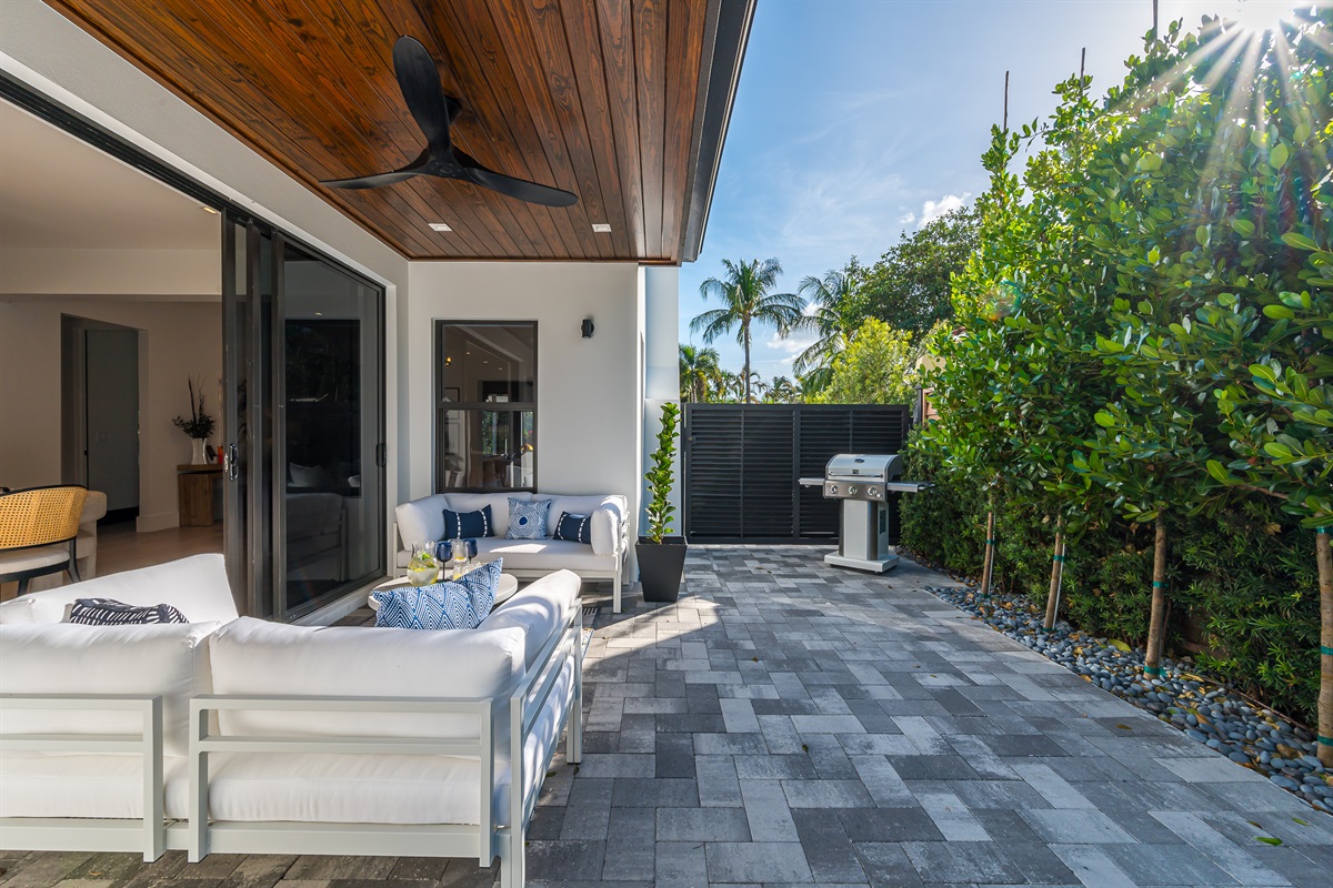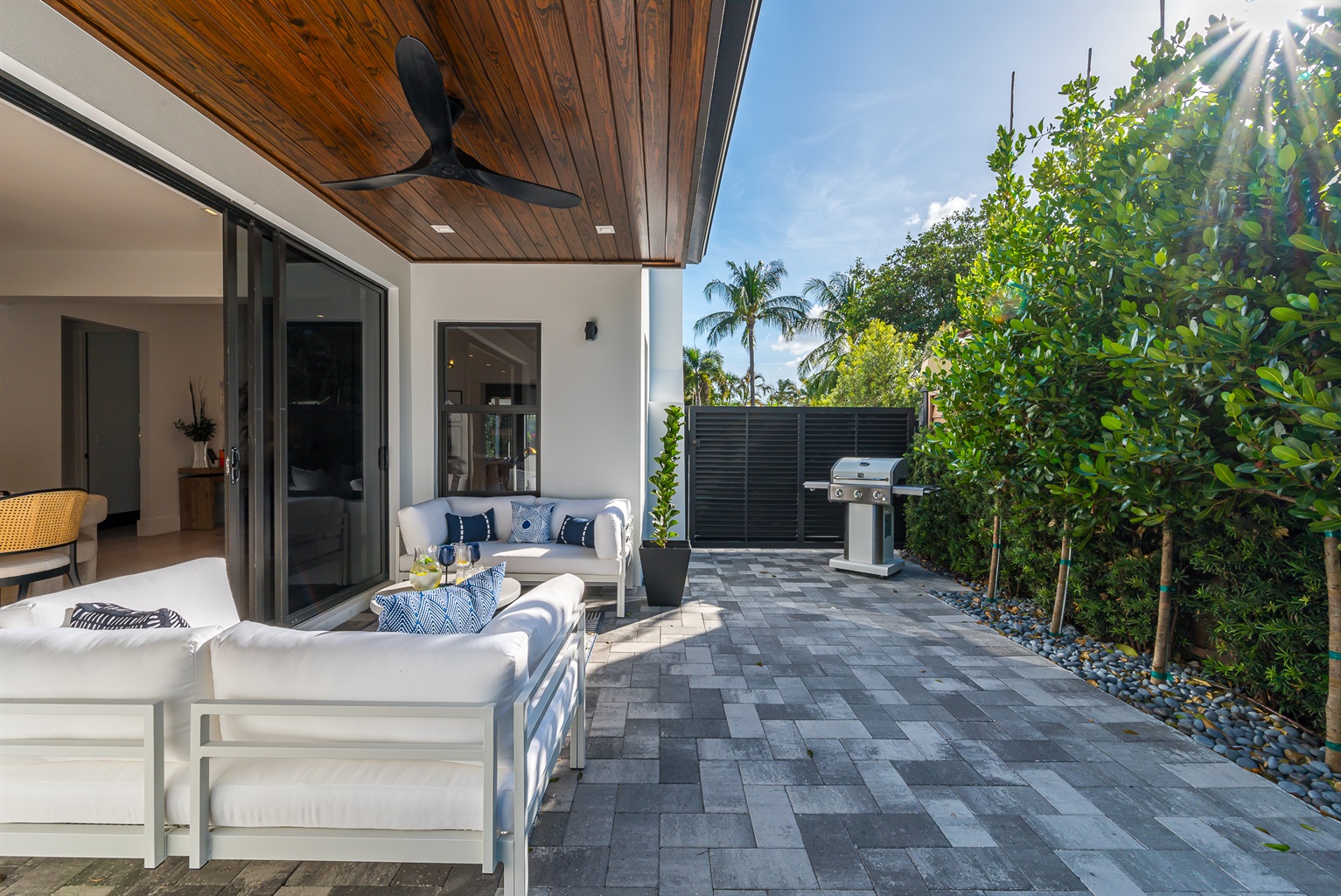 Indulge in the ultimate outdoor oasis. The fully fenced space has ample lounging including two Ramsey white outdoor sofas atop a chic denim geometric rug in a shaded nook. Savor a refreshing lemonade from the center Kellam Coffee Table, or dine under the stars at the stunning 8-seater dining set, nestled between bougainvillea-lined walls and professionally manicured greenery with black Mexican river rocks. Grill up some savory steaks at the barbecue for a warm alfresco dinner. The heated lap-pool is a breathtaking feature, complete with romantic color-changing lighting and surrounded by lush Traveler palms and white travertine tile. Soak up the sun for hours on the comfortable loungers or sip on cocktails under the massive black and white umbrella on the luxurious Aura outdoor patio sofa and chairs. Relax and experience the tropical climate of Florida at its finest in this exceptional space.