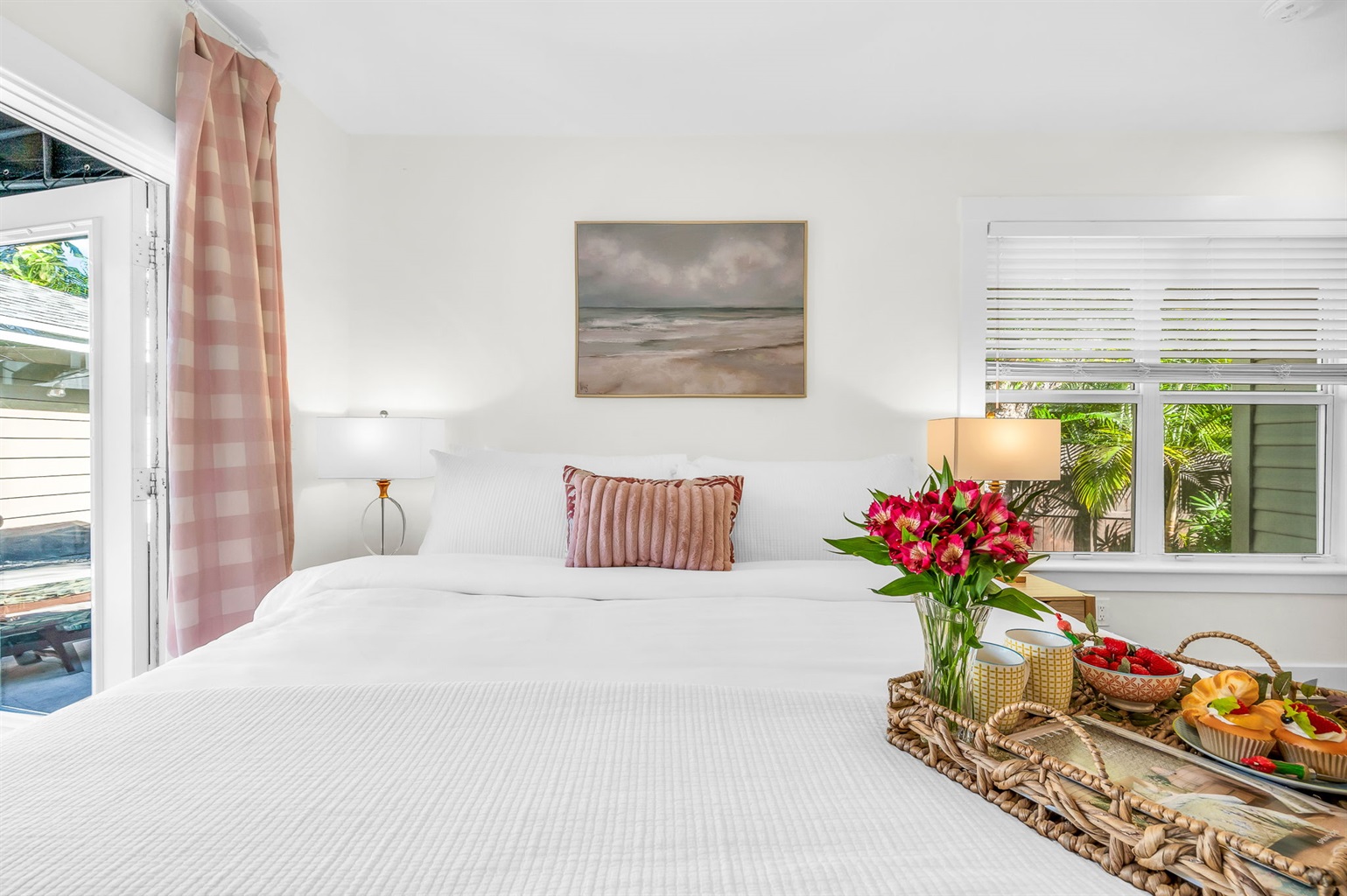 This serene retreat features a luxurious king-size bed atop a natural jute rug, flanked by modern wood end tables and a stunning glass lamp. Enjoy an en-suite bathroom, a smart TV with streaming apps, and beautiful French doors that lead directly to the pool deck—ideal for seamless indoor-outdoor living.