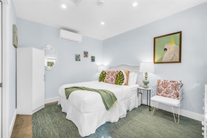 Privately tucked behind the main house, the guest house features its own entrance—perfect for couples or added privacy. Inside, you’ll find a queen bed, en-suite bathroom with royal blue vanity and step-in shower, dresser, hanging rack, smart TV, and a mini fridge, Keurig coffee maker, and in-unit washer/dryer add extra convenience.