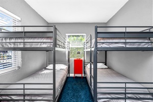 The 2nd bedroom includes 2 sets of bunk beds, a few toys, a pack n play, and colorful linens for the kids. There is a shared bathroom in the hallway with bedroom 3.