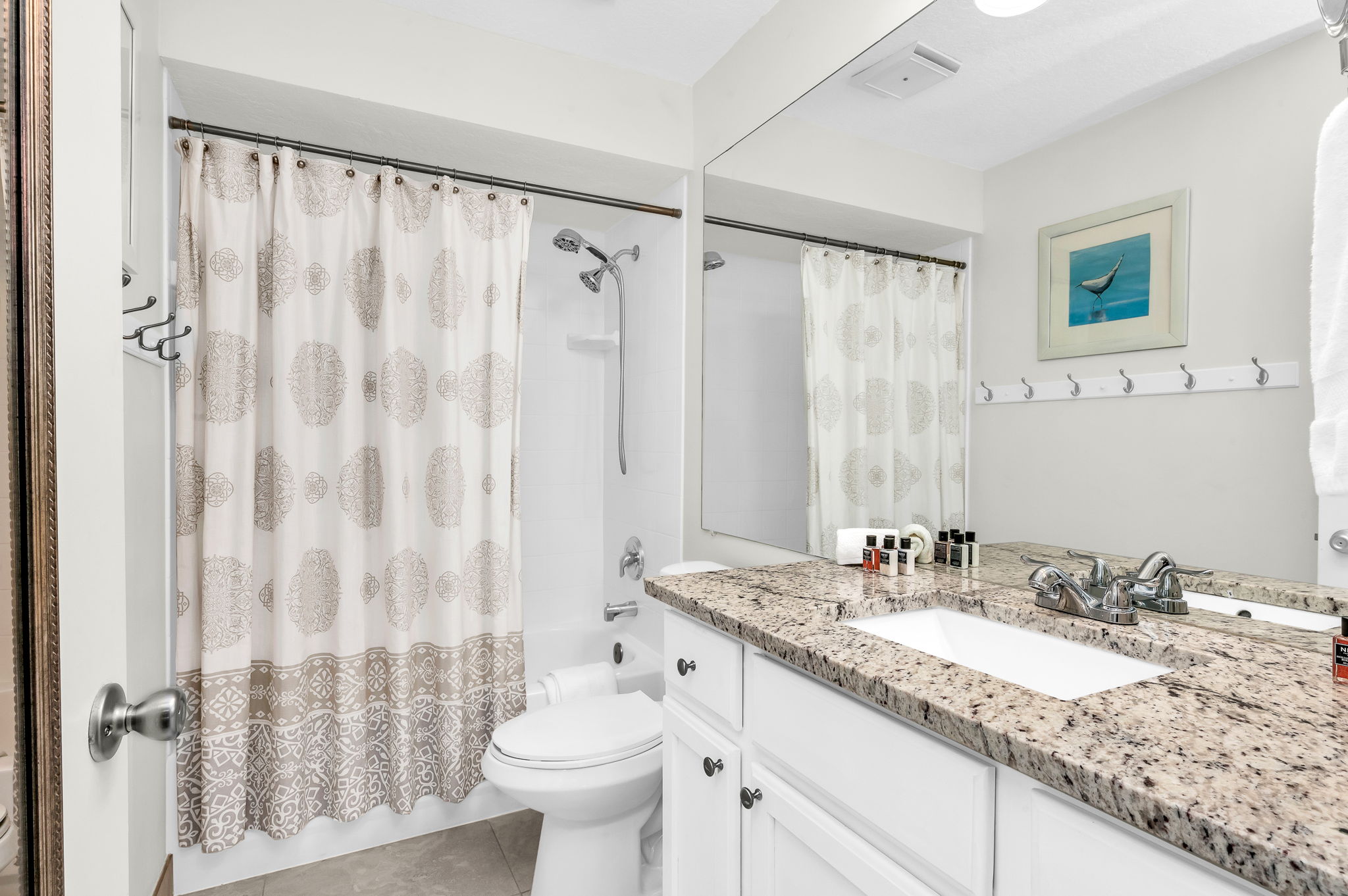 This bathroom sits just outside the 2nd bedroom. The bathroom has a step-in shower and single granite finished vanity. Fresh luxurious towels are provided.