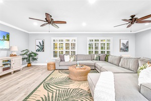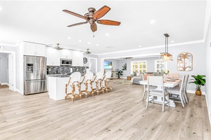 Step inside to a bright, open-concept living area featuring comfortable seating, coastal-inspired decor, and plenty of natural light. The 65” smart TV and a selection of board games make this space perfect for movie nights or family fun. Adjacent to the living room is the dining area, with a large table that invites group meals and conversation.