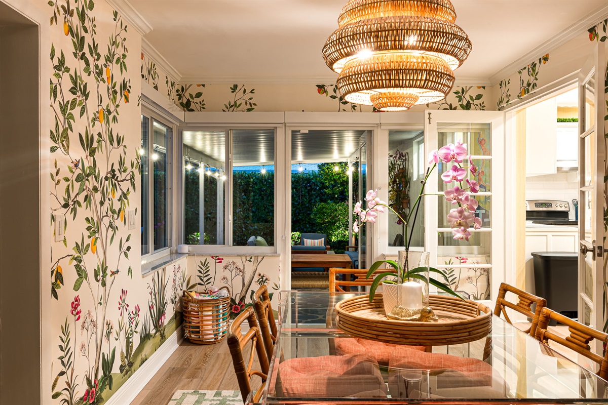 The modern kitchen includes stainless steel appliances, ample counter space, and essentials for meal prep. The adjacent dining area, styled with vibrant wallpaper and rattan lighting, seats six comfortably and opens to the pool deck for easy indoor-outdoor flow.