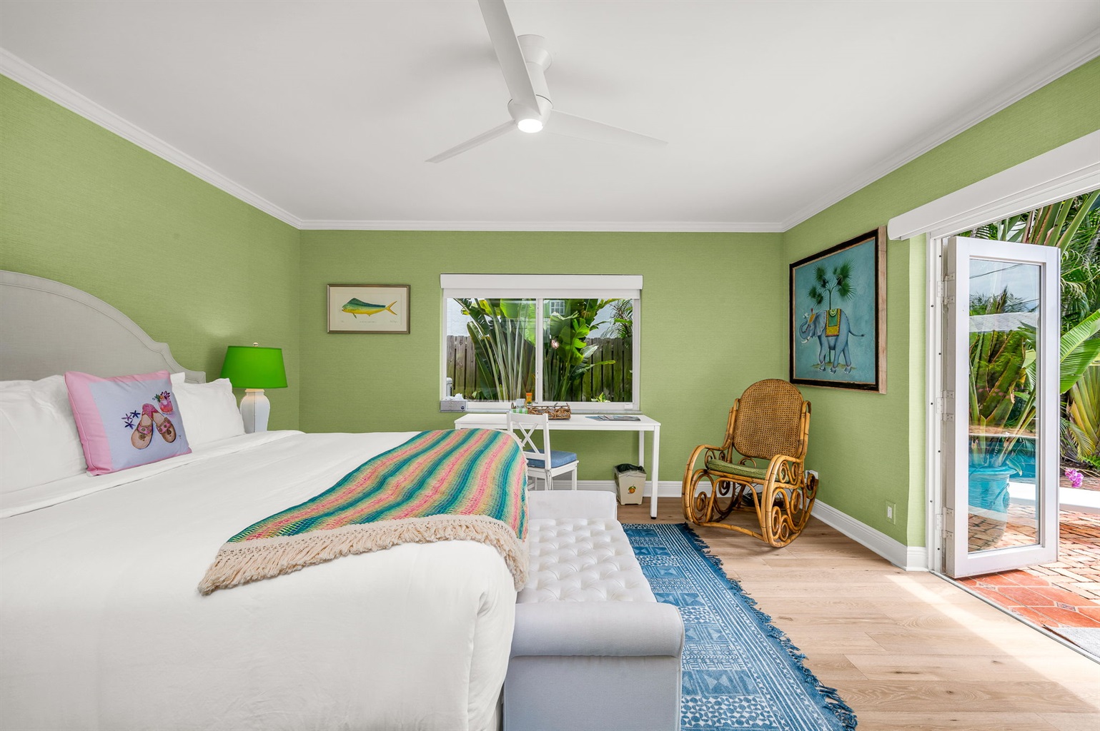 The sun-filled primary bedroom includes a king bed, blackout blinds, California Closets, and sliding doors leading directly to the pool deck. A spa-style en-suite bathroom and tasteful decor offer the perfect private escape.