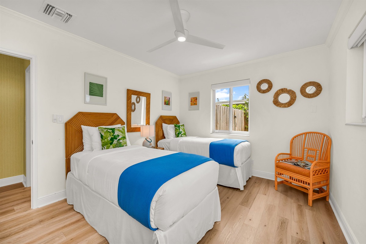 Two twin XL beds, rattan accents, and playful textiles create a fun, stylish space—great for friends or kids.