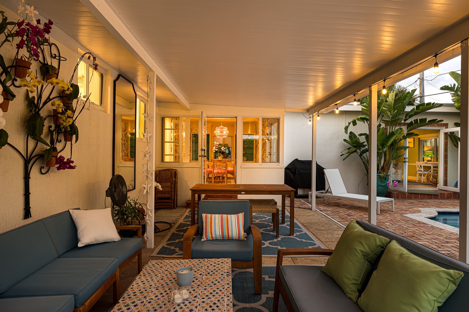 Your private backyard is a true retreat—lush landscaping, an orchid wall, and twinkling lights set the tone for relaxation. Enjoy poolside loungers, a covered dining area, and a heated pool for year-round comfort. Optional baby-proof fencing can be installed with 24-hour notice.