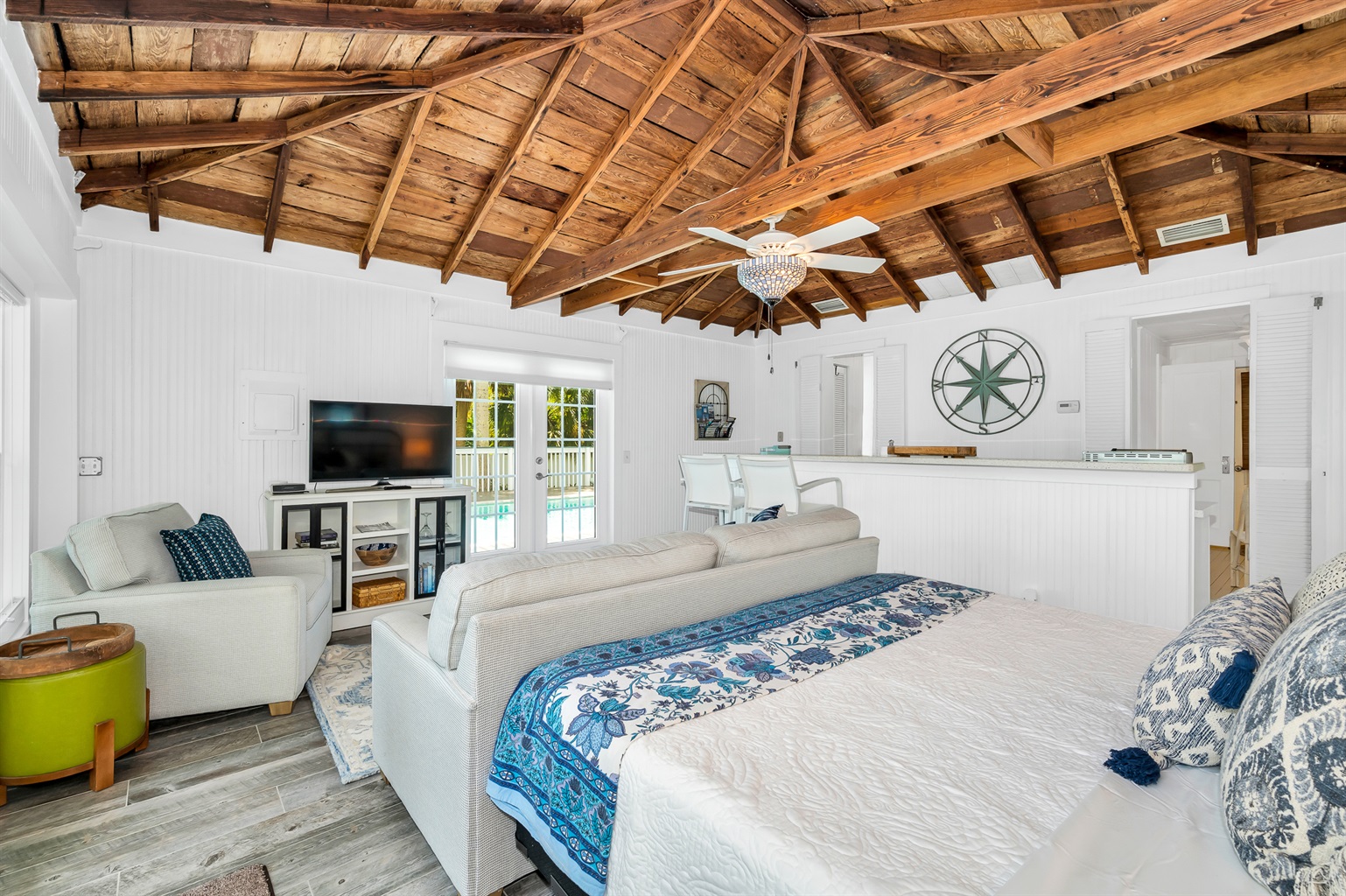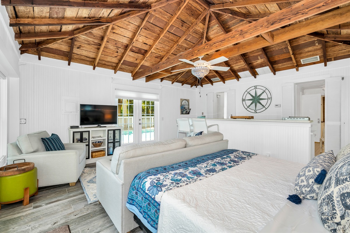 The stunning newly upgraded private Guest House is located outside the main house and attached to the pool deck. With a comfortable King Bed, Cypress wood ceilings, living room area with Smart TV & Wi-Fi, kitchenette with fridge, toaster oven, coffee maker, ice maker and counter seating. There is a white wicker dining set for 4, an additional sitting area and an en suite bathroom with a shower.