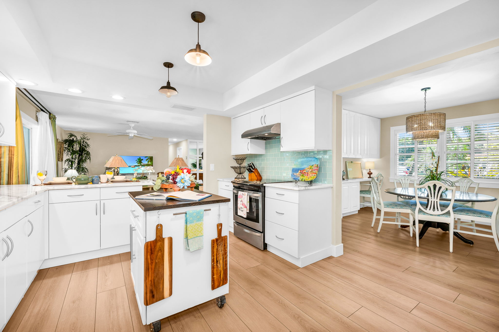 The impressive kitchen is complete with stainless steel appliances and double stainless fridge, a gorgeous aqua tile backsplash, white elegant cabinets, and an island for additonal cooking preparation.