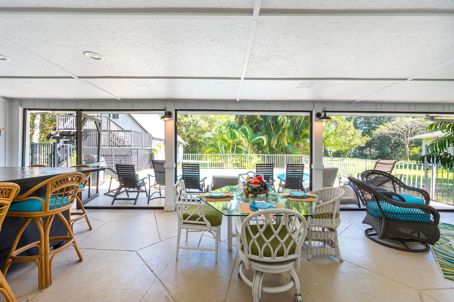 There is a wonderful outdoor space. The area is enclosed with netting to keep the mosquitos out so you can enjoy the evening. There is a bar counter and 4 bar stools for your favorite cocktails.