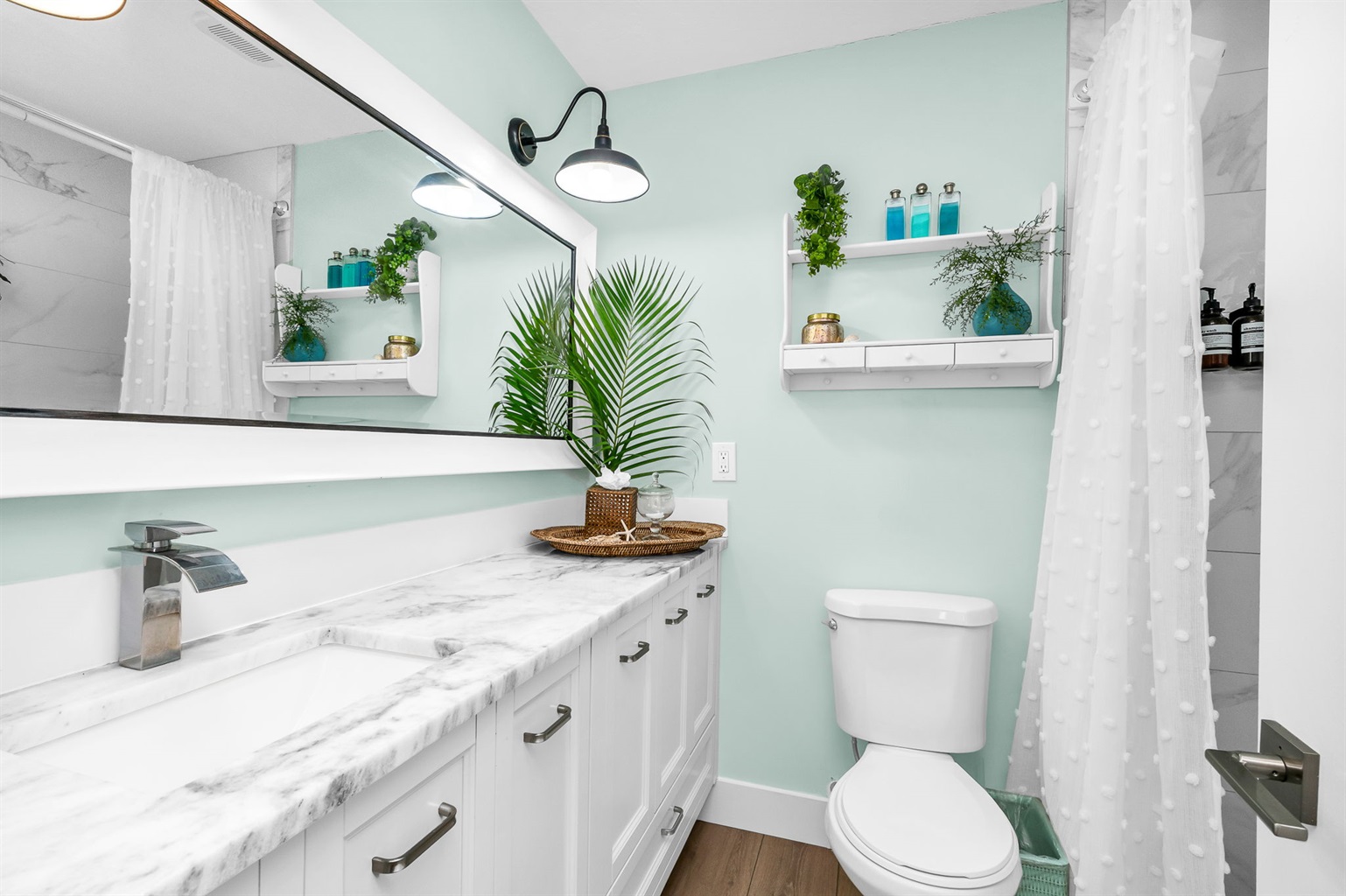 The second bathroom has a shower, marble vanity and shared between the bedroom 2 and 3 guests.